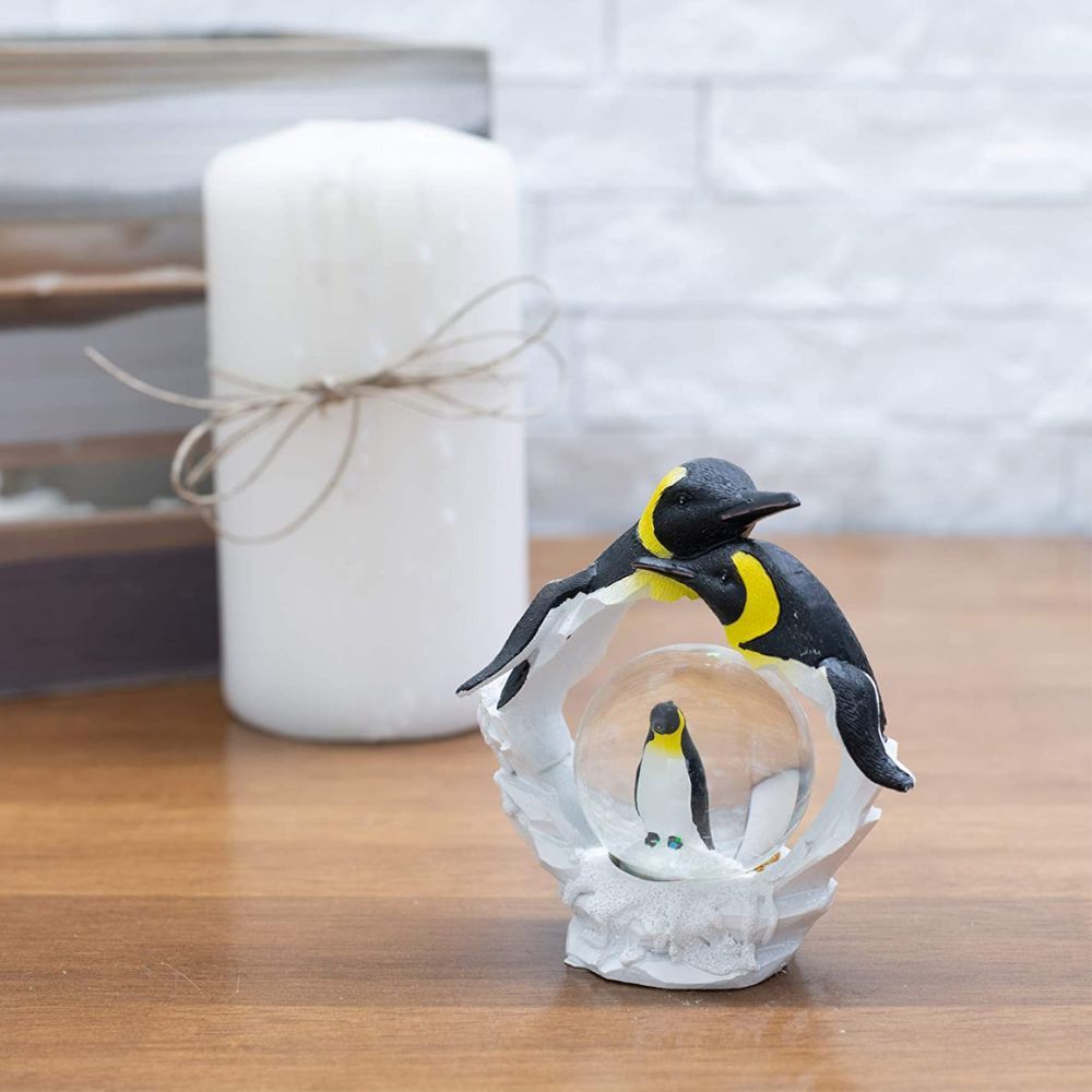 The mommy and daddy penguin figurine envelopes the small water globe and depicts a baby penguin in the snow. The penguin figurine is sculpted around the snow globe/water globe which gives it a realistic appearance.
