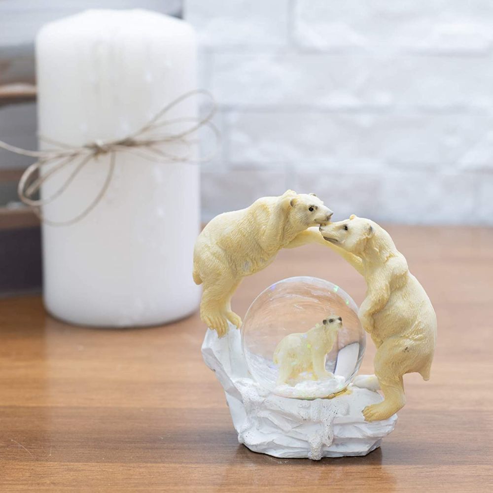 Elanze Designs White Polar Bear Family Snow Globe is the perfect choice for polar bear lovers. This snow globe mini features a mommy and daddy Polar Bear figurine that envelopes the small water globe and depicts a baby Polar Bear in the center.