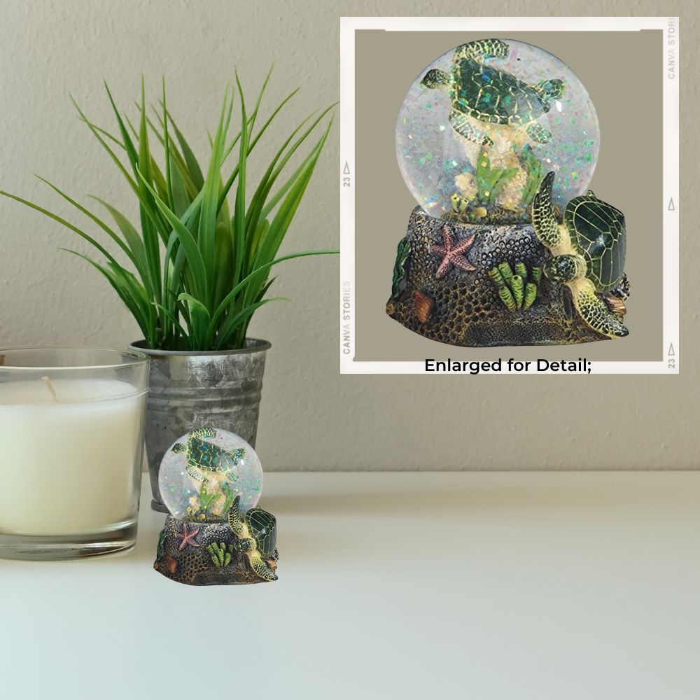 The Elanze Designs Sea Turtle Musical Water Globe is a perfect way to bring a touch of whimsy and fun to any home décor. This beautiful water globe features a Sea Turtle swimming in the ocean with a pedestal base made of resin polymer stone material with three dimensional Sea Turtles in a coral reef.