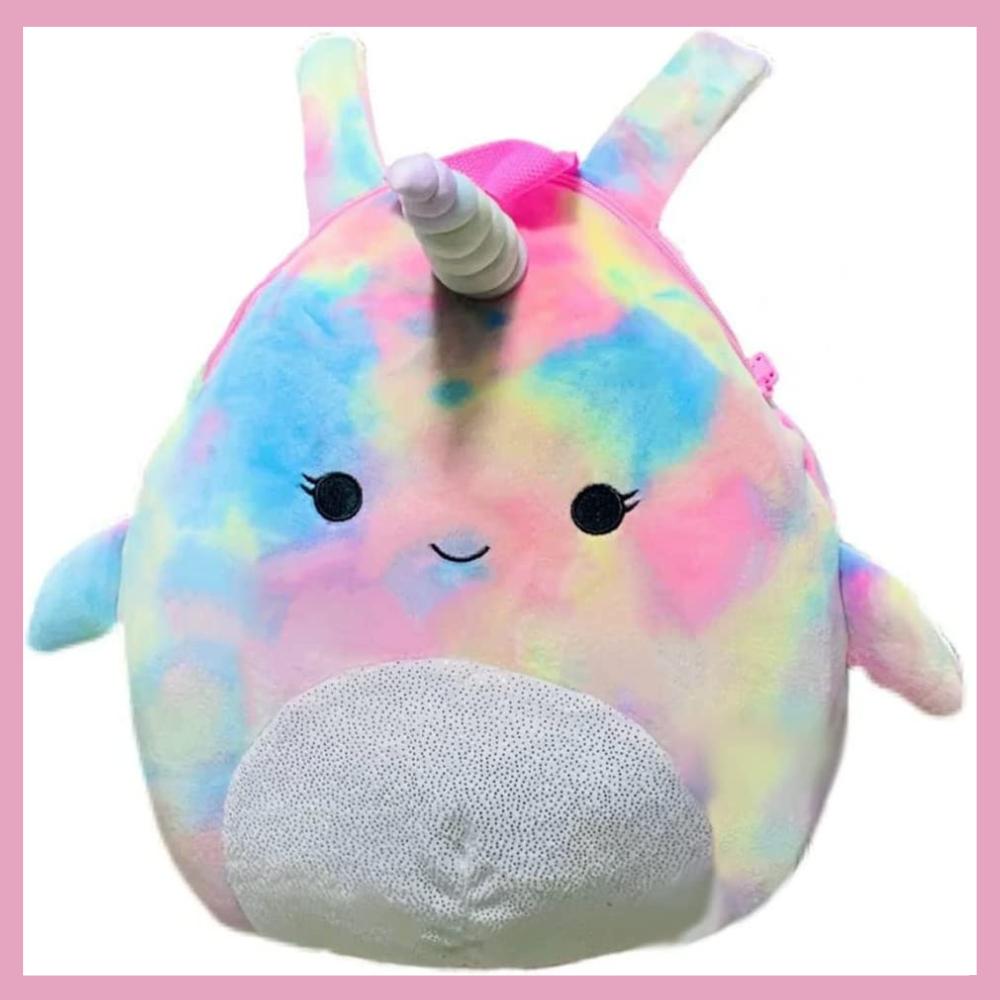 Squishmallow Navina Rainbow Narwhal Backpack is a must-have for all Squishmallow fans! This adorable and super soft plush backpack is perfect for carrying your books and supplies around. The cozy polyester fibers make it machine washable and suitable for all ages. Plus, each Squishmallow comes with its own unique bio to make them even more special. You can use it as a couch companion, pillow pal, bedtime buddy, travel mate, or even as a friend in times of need!