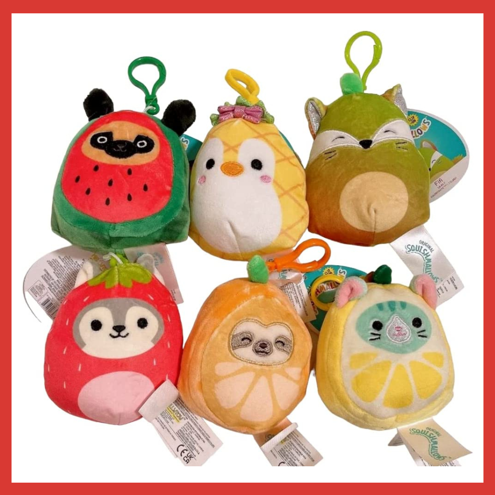Squishmallows Set of 6 Fruit Animal Squad 3.5" Clip On Keychain Mini Plush Dolls are perfect for any Squishmallows fan! These 6 adorable fruit plush toys are made from incredibly cozy polyester fiber, giving them a marshmallow-like texture that's pillow-soft. Plus, these plushies are the right size for taking with you wherever you go. They also come with a clip-on feature, making it easy to attach to your keys or backpack.