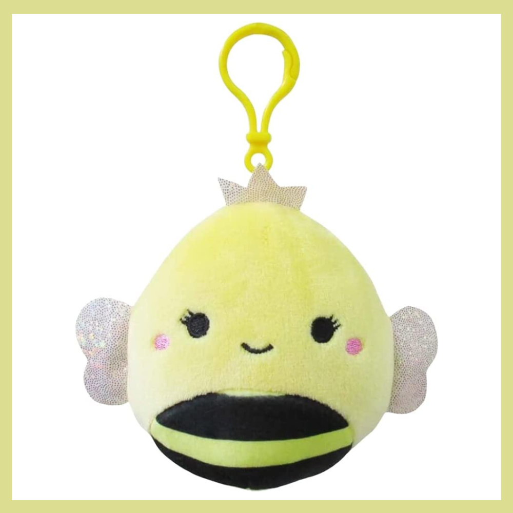 Squishmallow Sunny The Bee Keychain is the perfect way to show off your love of Squishmallows! This ultra-squeezable, 3.5-inch clip-on plush is made with high-quality and ultrasoft materials, perfect for taking with you wherever you go.The plushie is warm and cuddly, with a marshmallow-like texture that's pillow-soft. The perfect size for cuddling and snuggling, this adorable bee will become your kid's new favorite plushie!