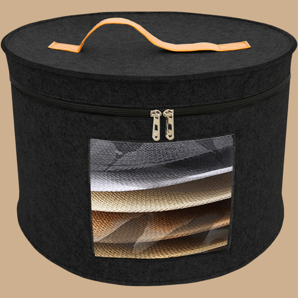 This Hat Box offers the perfect combination of protection, convenience, and style. The thick, durable felt material protects your hats from dust, dirt, moisture, and other environmental factors; the clear viewing window lets you easily see which hat is inside, and the zippered lid makes access easy.
