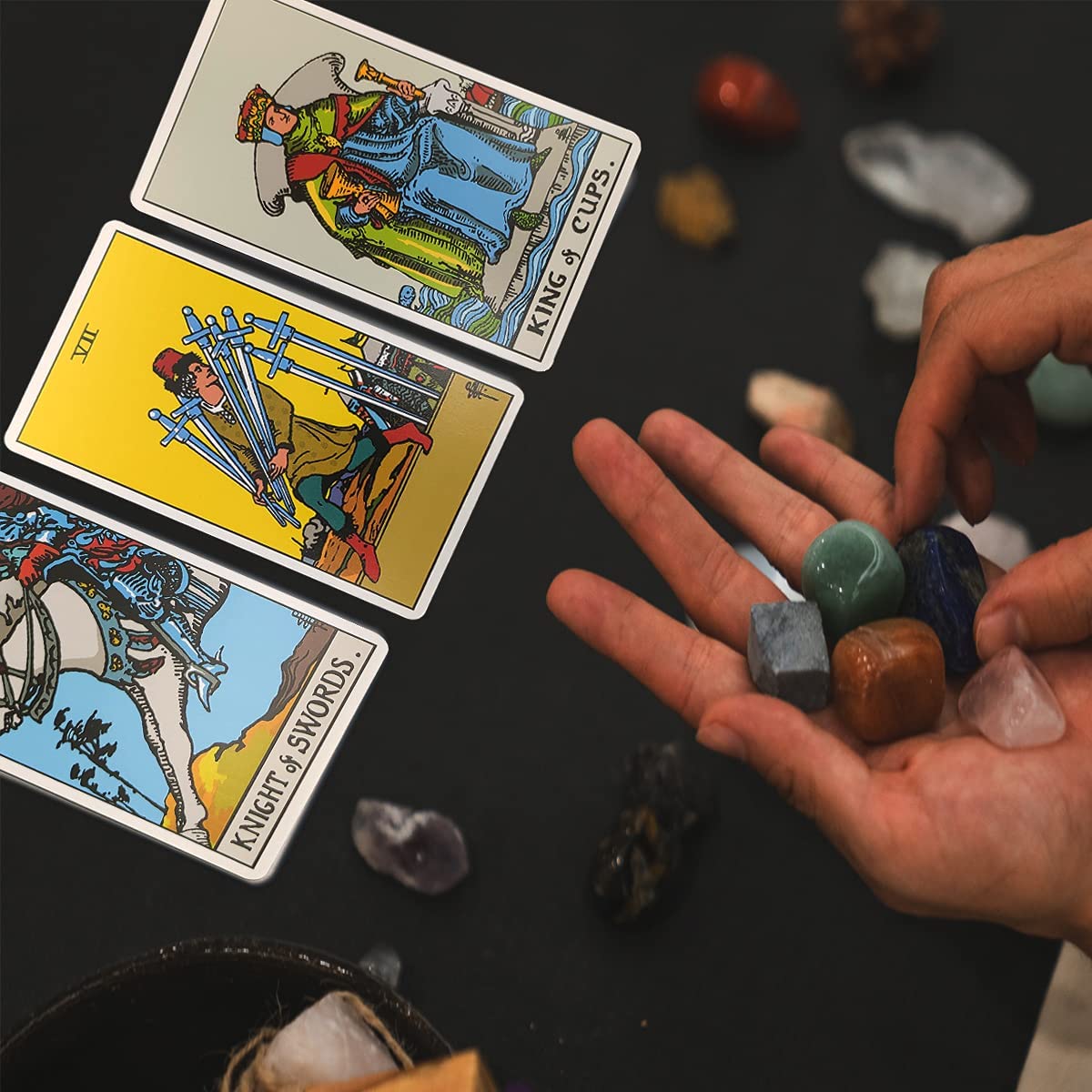 YixangDD Tarot Cards with Guide Book 18 Piece Set: All You Need To get Started is a powerful tool for self-reflection and growth, inner wisdom and potential. This set includes 78 tarot cards, 6 mini crystal spell jars, 7 chakra stones, 1 spirit pendulum, 1 tarot cloth, 1 goddess of earth pendulum mat, and 1 velvet bag. Tarot cards are an exciting way to explore, discover and learn about yourself and your surroundings. Each card has a unique meaning and can be interpreted differently depending on how the cards appear in a divination spread. Plus, YixangDD's set also comes with helpful accessories such as the mini crystal spell jars and chakra stones, making it a great tool for learning and practicing the Tarot.