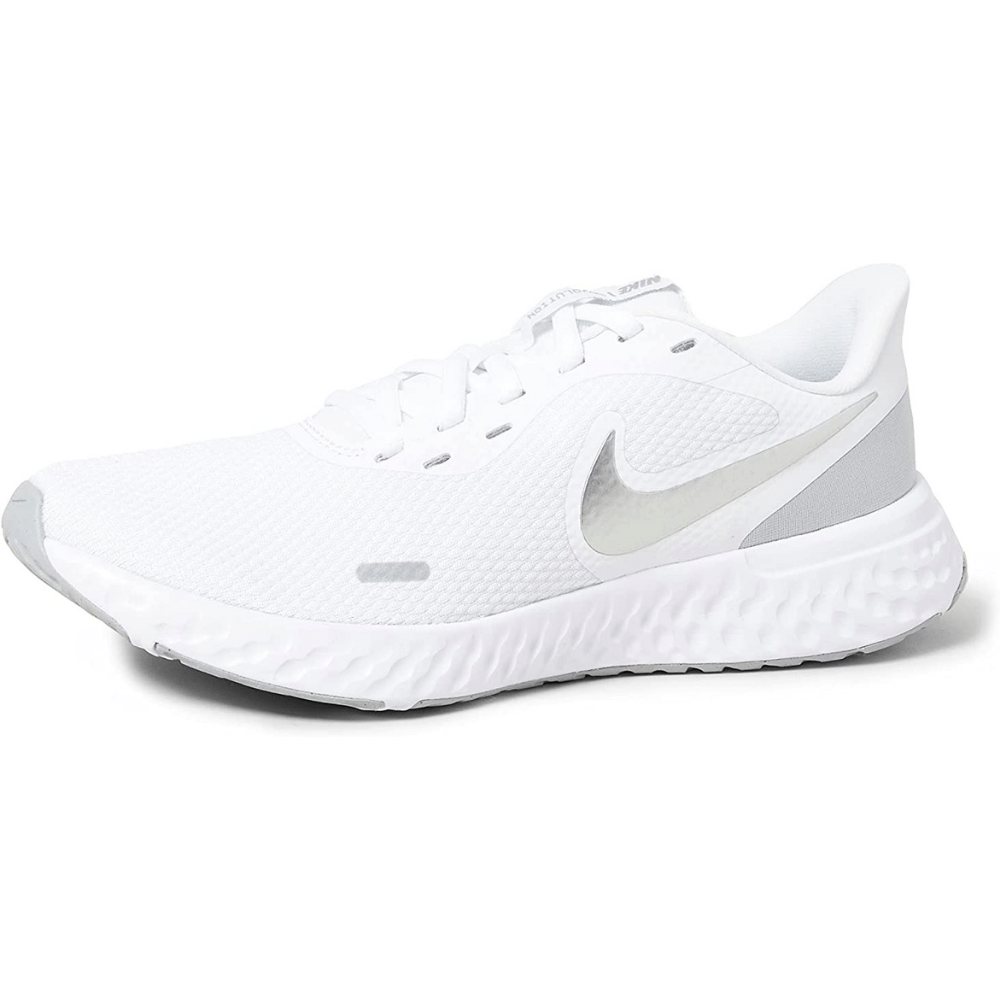 This white Nike Running Shoe has a shaft that measures approximately low-top from arch, and the mesh upper provides optimal breathability. With its lightweight and responsive cushioning and durable traction, the Nike Revolution 5 is the perfect running shoe for women and is sure to keep you comfortable and supported while running.