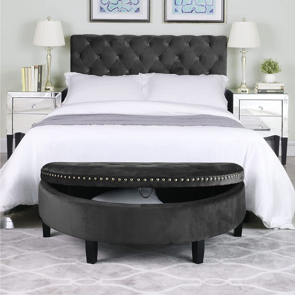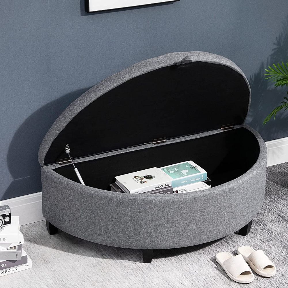 The Joveco Half Moon Storage Ottoman is not only stylish, but it's also sturdy and can hold up to 660lbs. Plus, it has an easy to assemble design and is available in other colors as well.