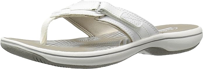 The Clarks Women's Breeze Sea Sandals are perfect for everyday wear. This lightweight Cloudsteppers flip flop features a hook and loop closure that ensures a secure fit, an EVA midsole for a weightless feel, and an airy EVA footbed that absorbs shock without adding weight. With its classic silhouette and stylish design, you'll be stepping out in style.