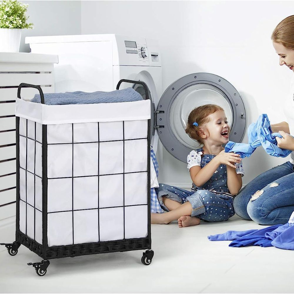 This hamper has a large capacity and comes with a removable canvas bag, making it easy to transport. Additionally, it's equipped with rolling wheels that make it easy to move around the house.