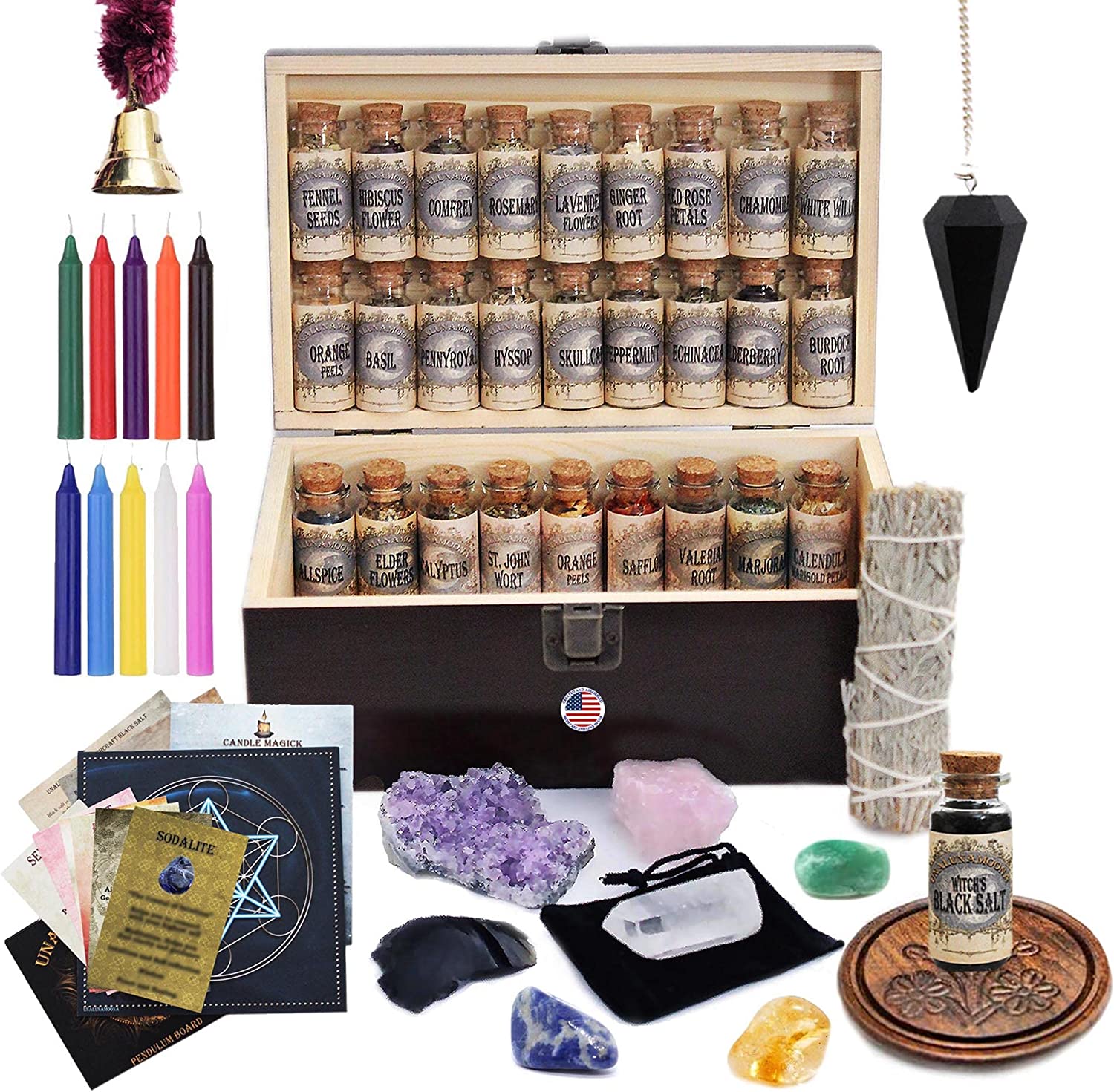 CraftMystic - Witchcraft Supplies Kit for Witch Spells – Beginner Witch Starter Kit Crystals Jars Dried Herbs and Colored Candles for Witches Pagan Altar Décor - Wiccan Supplies and Tools Box Witchy Gifts Stuff is a must-have for witches everywhere! This all-in-one kit includes 12 individually sealed dried herbs packages, 12 mini gemstones sealed bottles, and 12 colored candles; it has everything you need to buy to make a little magic happen!