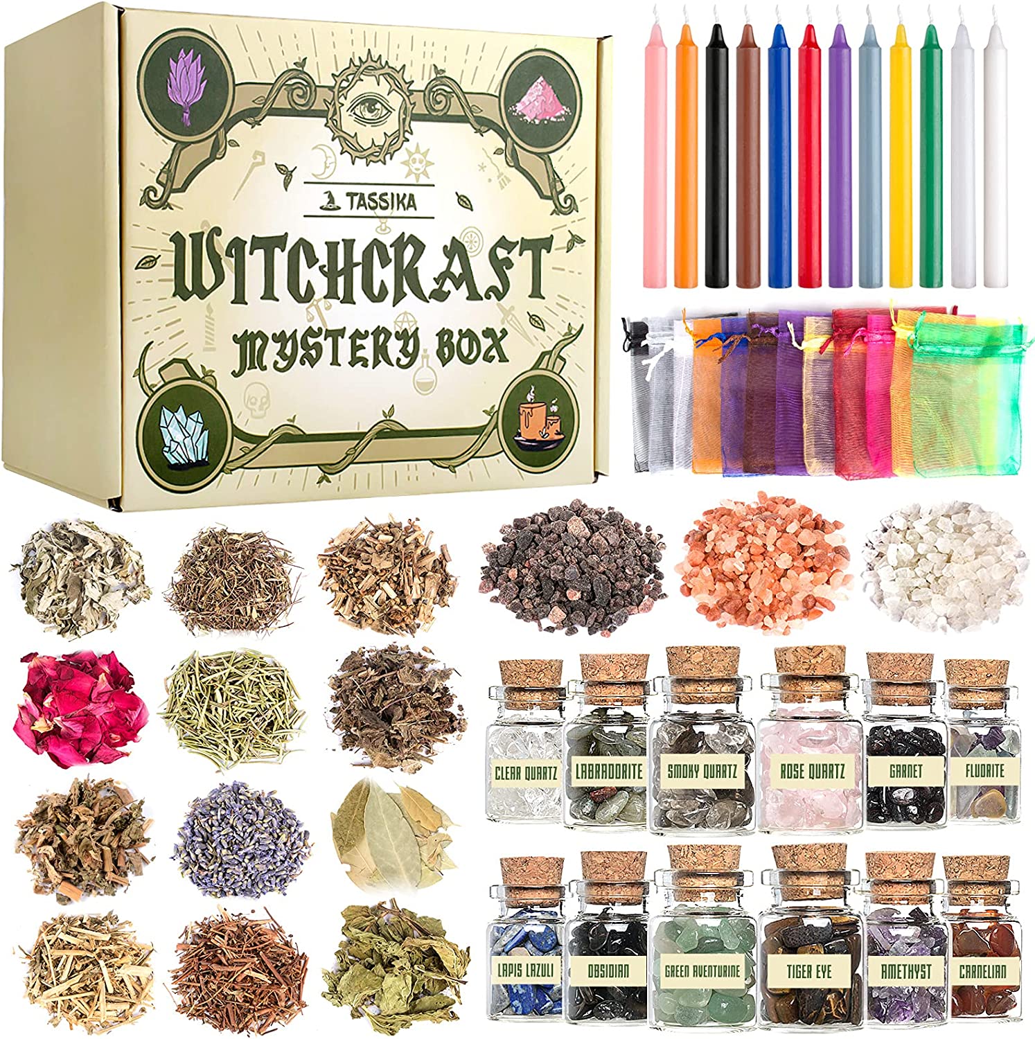Tassika - Witchcraft Starter Kit is an all-in-one set of witchcraft supplies, perfect for beginners and experienced witches alike. This kit includes 12 mini crystal bottles, 12 sealed dried herbs with labels, 12 colored spell candles, 12 small organza pouches, 3 witches salts, and 12 parchment pages - everything you need to practice positive witchcraft.